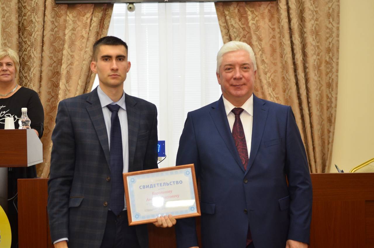 Свидетельство об именной стипендии вручал ректор ПГУ, председатель Совета ректоров вузов Пензенской области, канд. юридич. наук Александр Дмитриевич Гуляков.