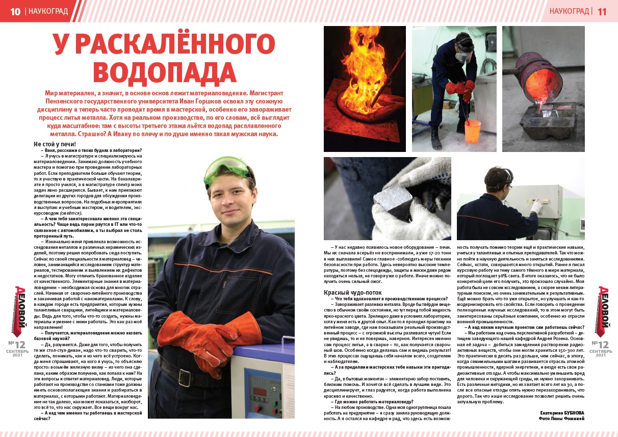В детско-юношеской газете Пензенской области "Деловой" выпуск №12 от 20-го сентября (201) 2021 года опубликовано интервью с магистрантом кафедры «Сварочное, литейное производство и материаловедение» Пензенского государственного университета Горшковым И.С. "У раскаленного водопада"
