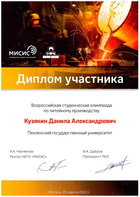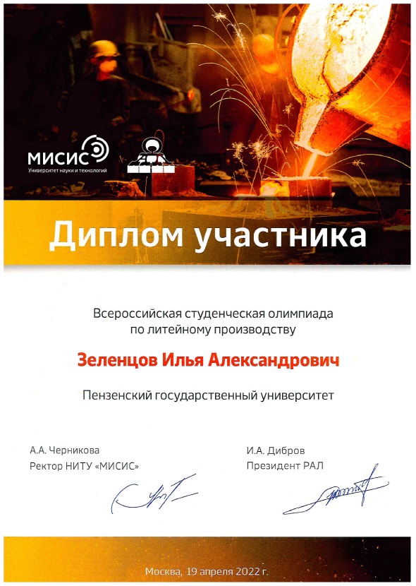 Студенты 3 курса, гр. 19МО2 Зеленцов Илья, Вязовский Дмитрий, Кузякин Данила, Максимов Александр под руководством преподавателей, каф. «СЛП и М» Голотенкова О.Н., Семушкина А.В., Казанцева С.Н., Дуриной Т.А. - 19 апреля 2022г. приняли дистанционное участие во Всероссийской студенческой олимпиадt по литейному производству-2022, которая состоялась 19 апреля 2022 года в НИТУ «МИСиС».