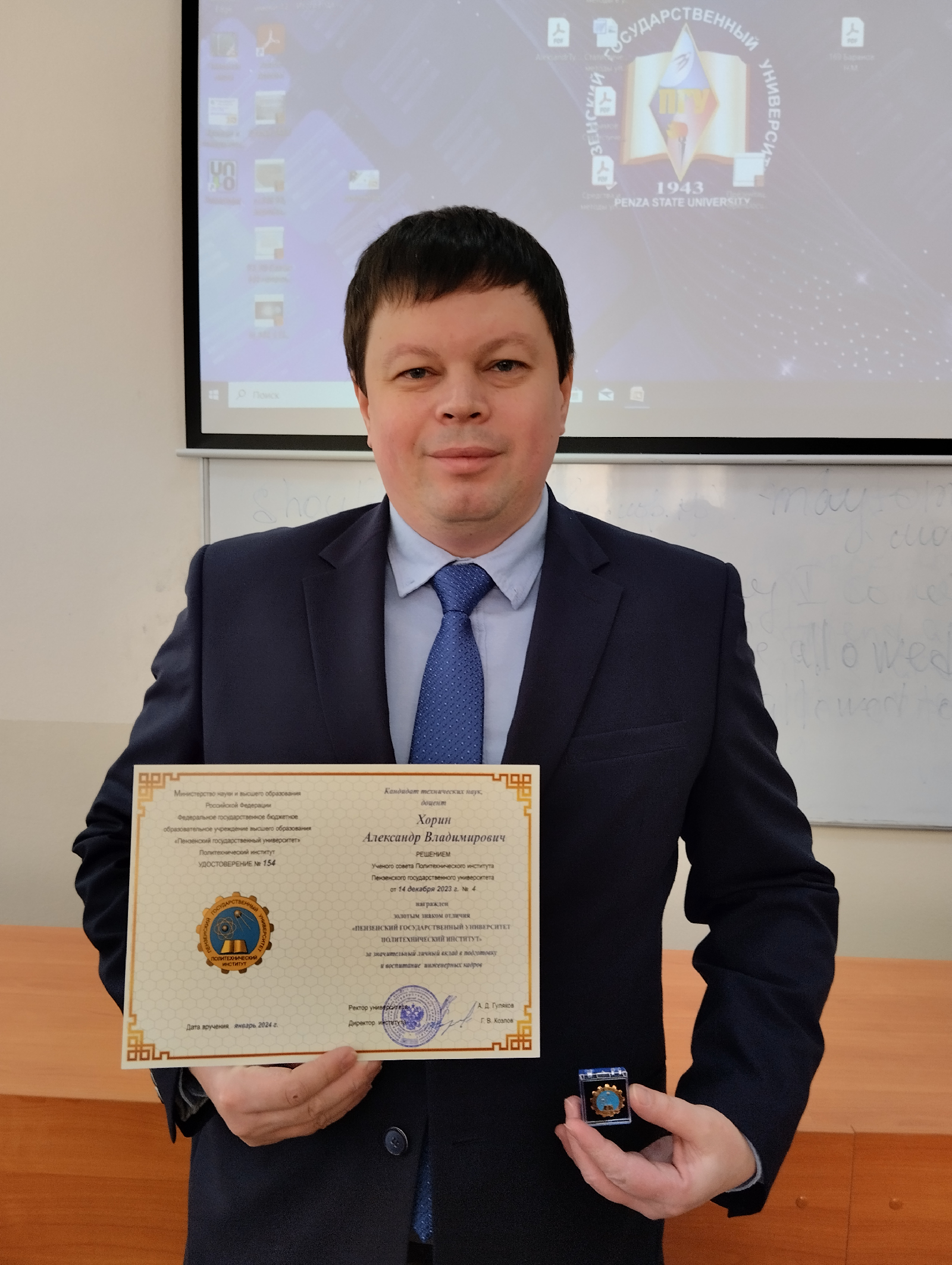 15.02.2024 состоялось торжественное заседании Совета ФПТЭТ, на котором были награждены Золотым знаком отличия "ПЕНЗЕНСКИЙ ГОСУДАРСТВЕННЫЙ УНИВЕРСИТЕТ. ПОЛИТЕХНИЧЕСКИЙ ИНСТИТУТ" : к.т.н., доцент каф. СЛПиМ, Хорин Александр Владимирович и ветеран каф. "СЛПиМ", к.т.н., профессор Кирин Евгений Михайлович. Евгений Михайлович выразил признательность за оценку его профессиональной деятельности.