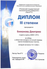 Дипломом lll степени награждён студент гр. 22МО1, Бижанов Дмитрий, за победу в областном конкурсе на лучший перевод научно-познавательных текстов. Конкурс состоялся в ноябре прошлого года в ПензГТУ.